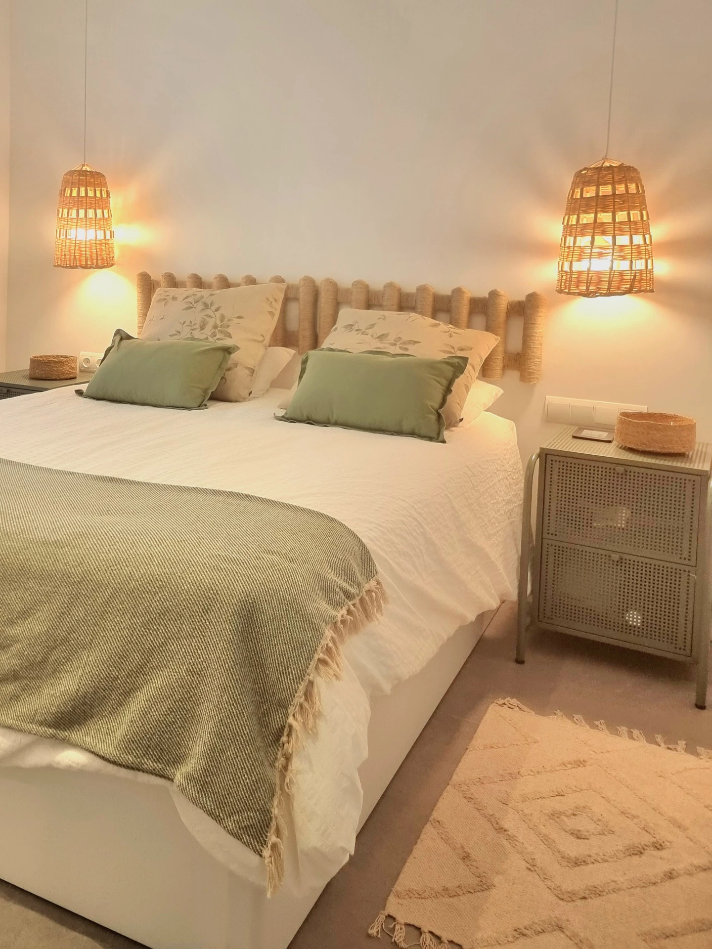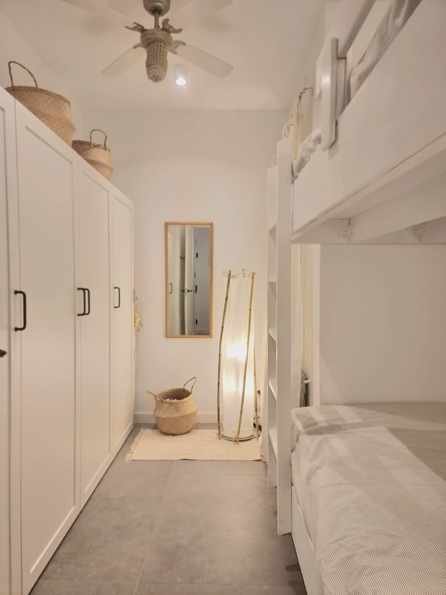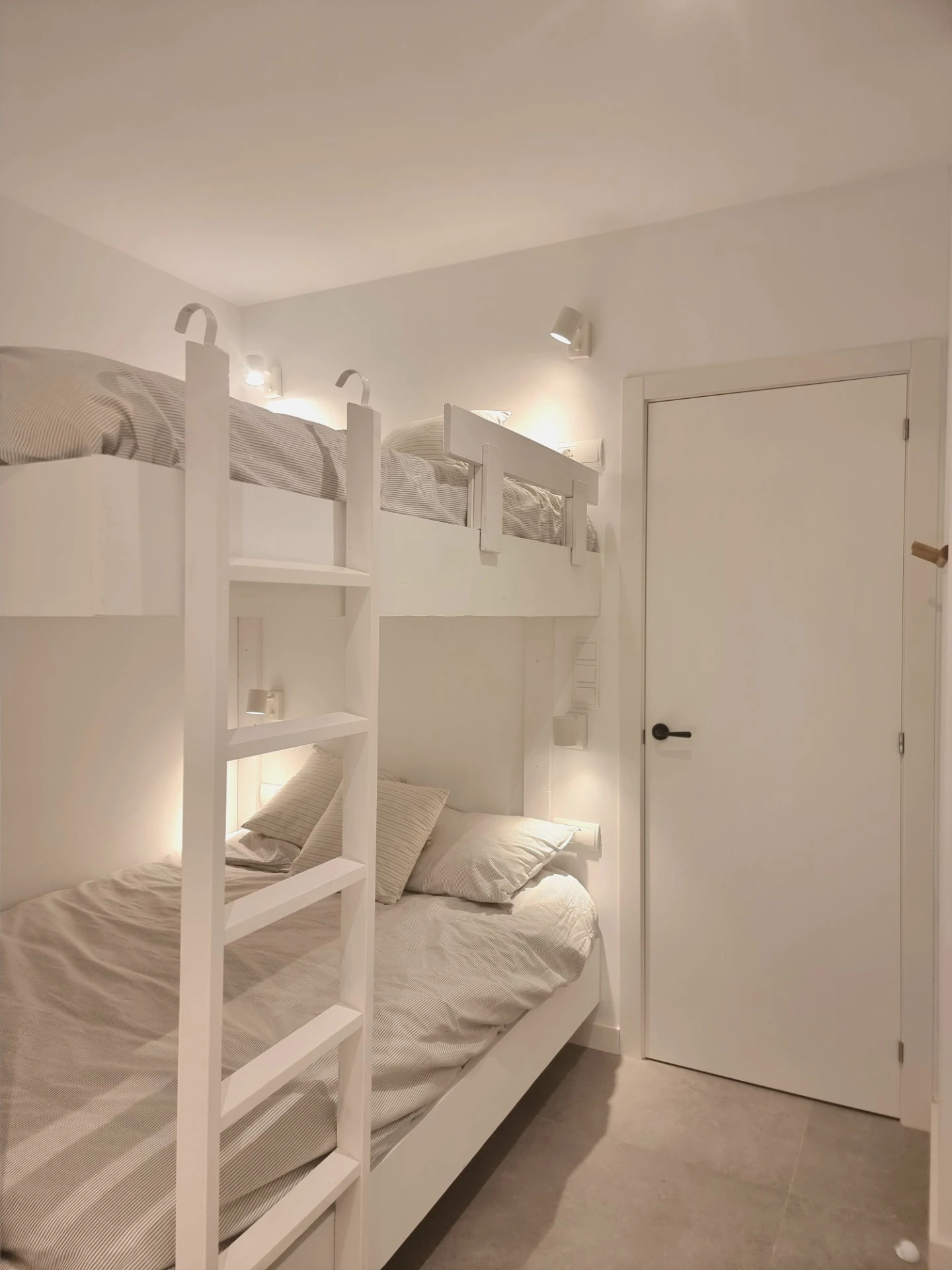 Para cumplir con sus requerimientos, eliminamos una de las habitaciones y abrimos la cocina cerrada, integrándola al salón y al nuevo gran ventanal, lo que permitió mejorar la conexión entre los espacios y aprovechar mejor la luz natural. Además, se diseñó una solución creativa para alojar a sus hijos y nietos: en la segunda habitación, instalamos una litera de camas de matrimonio y un amplio armario, maximizando la funcionalidad del espacio.